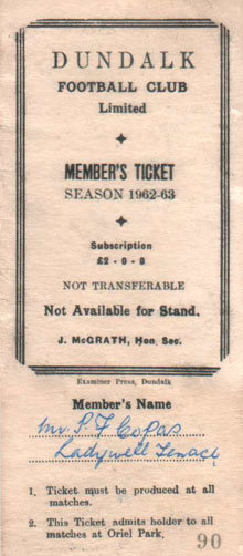 Before that he had taken up golf and in 1969 had won the captain’s prize at Baltinglass Golf Club. He then mastered pitch and putt, became a scratch handicapper, won over 200 open tournaments, was the 1979 National Strokeplay Champion, and in 2003 was inducted into the Pitch and Putt Hall of Fame. A motor mechanic, his last visit to Oriel Park was on the occasion of the re-union of the 1963 Championship team.